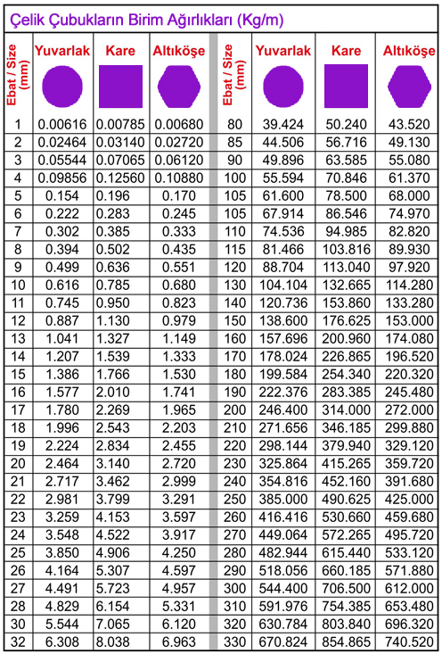 Çelik Ağırlık Tablosu